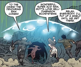 Following the return of magic, Dawn demonstrated a stronger link to her Key status. It was seen when the Soul Glutton tried to devour her soul, which resulted in him losing his energy and giant size. Shocked and surprised that she was the fabled Key, he revealed that her mystical energy was too pure for him, comparing it to poison.[78] While in an entirely magic-based reality of the hell dimension of Anharra, Dawn used this power to destroy the demon god-king Kerberon. Giles describes her "god-like" powers,[64] and Dawn become feared an worshiped by Anharran demons as well, then classified as a higher being. Among her powers, she discovered able to open portals to more dimensions, destroy the barriers separating them (which can lead to an apocalypse), shrink and destroy powerful demons with a flick of her wrist, and even create a force field in order to protect herself and others.[65][66][67]