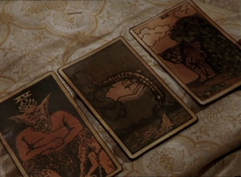 - Cartomancy: Drusilla had the power to gain insight into a question or situation using cards — she once used a set of Tarot cards to inform Spike that the Du Lac Cross was needed to translate the Du Lac Manuscript, and the cards she pointed to not only consisted of the image of where the cross was located, but also predicted the order in which the three Tarakan assassins would attack Buffy (first, the cyclops for Octarus, then the insect for Norman Pfister, and finally, the jaguar for Patrice). Last but not least, the cards revealed to Spike and Drusilla whom the key to her cure was (Angel, her own sire).[40]