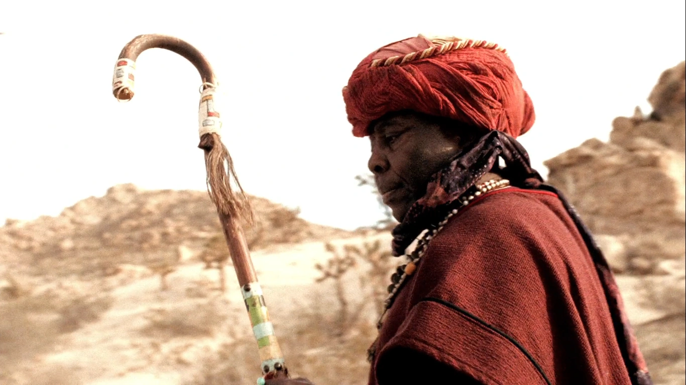 While two of these staves were straight, the third was curved at the end, and was more decorated than the simple white leather the others had tied: with beads, straw, and colorful designs. This unique staff was wielded by the wizard who opened the box of the shadow demon, while the two others rhythmically hit their staves on the floor during the ritual, imbuing the demon's power over Sineya, the first Slayer.[1]