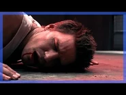 Inside, Baker beats on Angel, who still won't fight back. Cordelia and Wesley enter, spotting Darin, who's holding a bracelet. Wesley notes that these demon matches have been revived from the Roman Empire and that the bracelets kill people if they're wearing them when they cross the red line. Darin puts the bracelet down and gestures for a guard to drop a knife into the pit. Baker picks the knife up, cutting Angel's arm with it. Angel morphs into vamp face and the crowd chants: "Killing blow!" Angel defends himself from a few more hits, then stabs Baker in the chest with the knife. Once Baker is dead, the announcer says that Angel has made his first career kill.