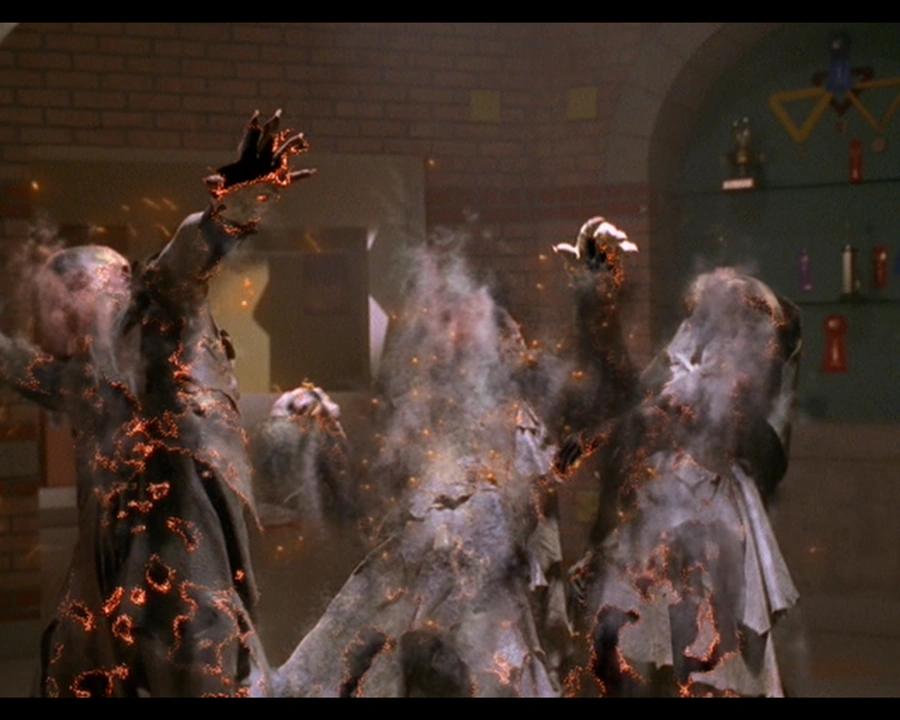 Buffy and the other Slayers went into the Hellmouth itself to fight the Turok-Han. In the end, all of them were apparently killed, including thousands by the mystical amulet that entrapped Spike.[7] Spike would later remark that the Turok-Han was part of a list of "things that just [didn't] exist anymore."[8]