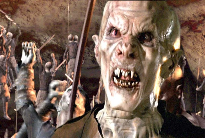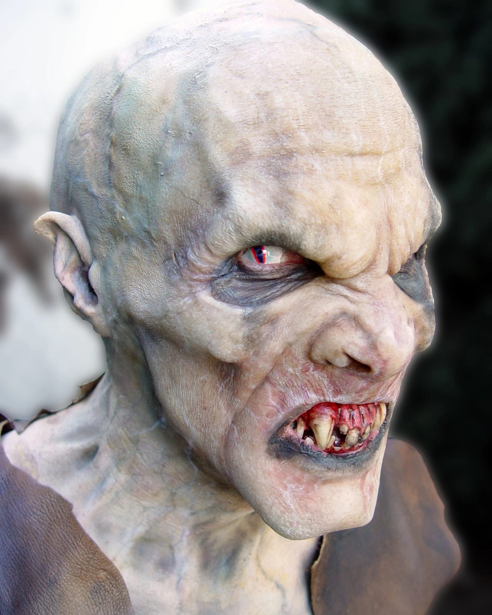 The Turok-Han resembled pale, bald humanoid beings with the pronounced brow ridges. Their eyes were clear save for black slit pupils. They had flat bat-like noses, sharpened teeth, pointed ears, and long nails. Each Turok-Han was clad in a black, leathery outfit. Just like vampires, the Turok-Hans' bodies and clothes turn to dust upon death.[3][7]